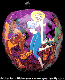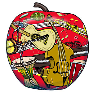 | Life is a Party For Those Who Dance!: Crazy and energetic dancers cavort madly around this Apple- with the band playing on in the background. This design was hand painted with professional artists acrylics and sealed with clear coat. The job was completed in 3 weeks. The Apple was placed at 888 7th Ave in Manhattan. That's between 57th & 58th Streets, next to the Brooklyn Diner. It was presumably auctioned off and it's current location is unknown. | | |