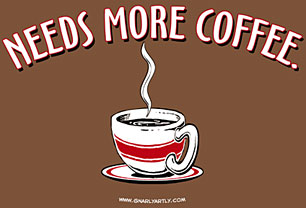 | Title: Needs More Coffee Printed on: short sleeve 100% heavyweight cotton Color of shirt: Chocolate or Black Sizes: S, M, L, XL , XXL *Don't know your size? Click here for Sizing help. Price: $20 ea. Call the Toll Free number above (M-F 8 am- 5 pm EST) Use Visa, Mastercard, AMEX or Discover. Wholesale buyers go here (24 shirts or more) |
