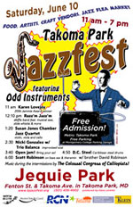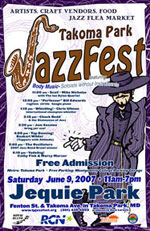 Posters and shirts for Takoma Park Jazzfest. Currently held every June in Old Town TP.