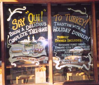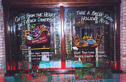 La Madeleine holiday promotions each pane about 4'x6'